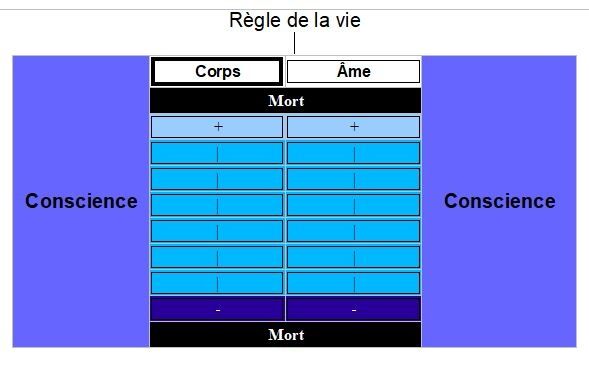 Le Corps et l’Âme ont chacun un niveau d'état symbolisé en bas de page par un diagramme. Aligner ces états procure un bien être quelque soit le niveau de Conscience. Le niveau de Conscience, en revanche, plus il est élevé, plus l'objet est vivant.